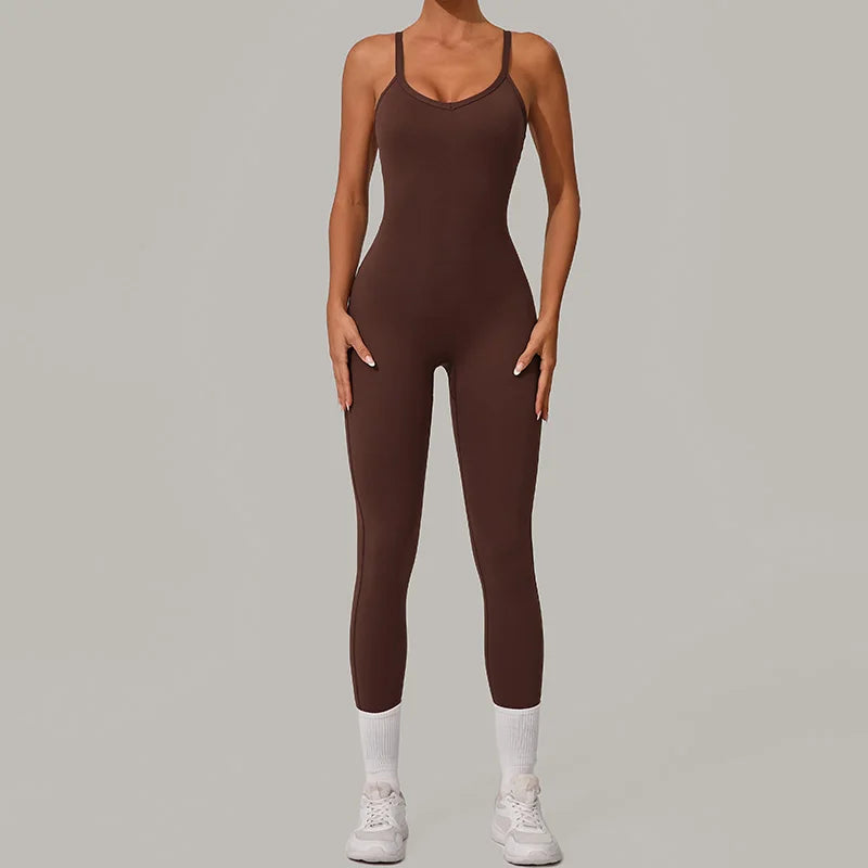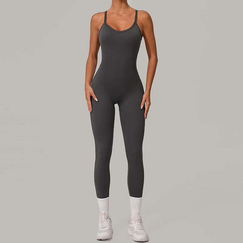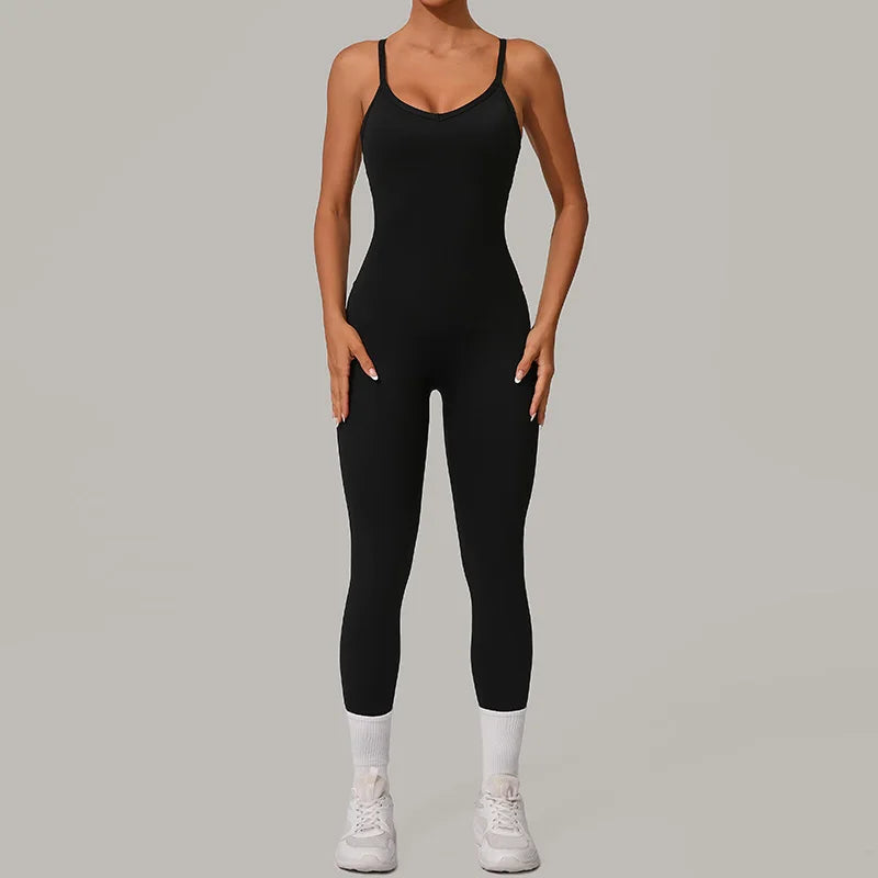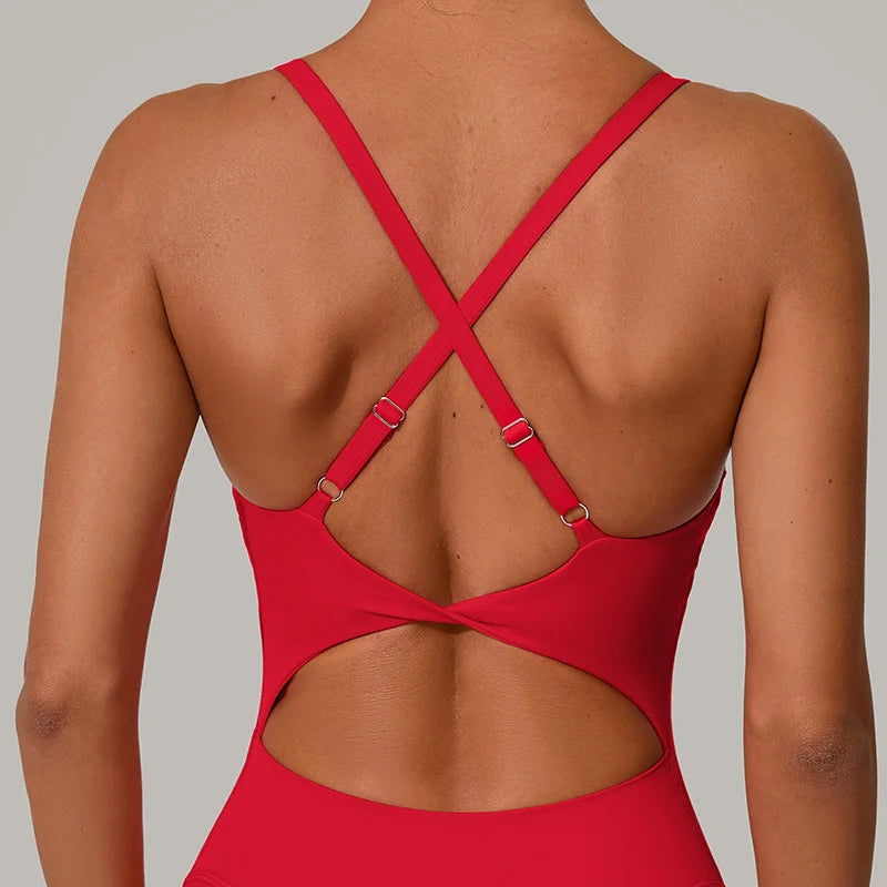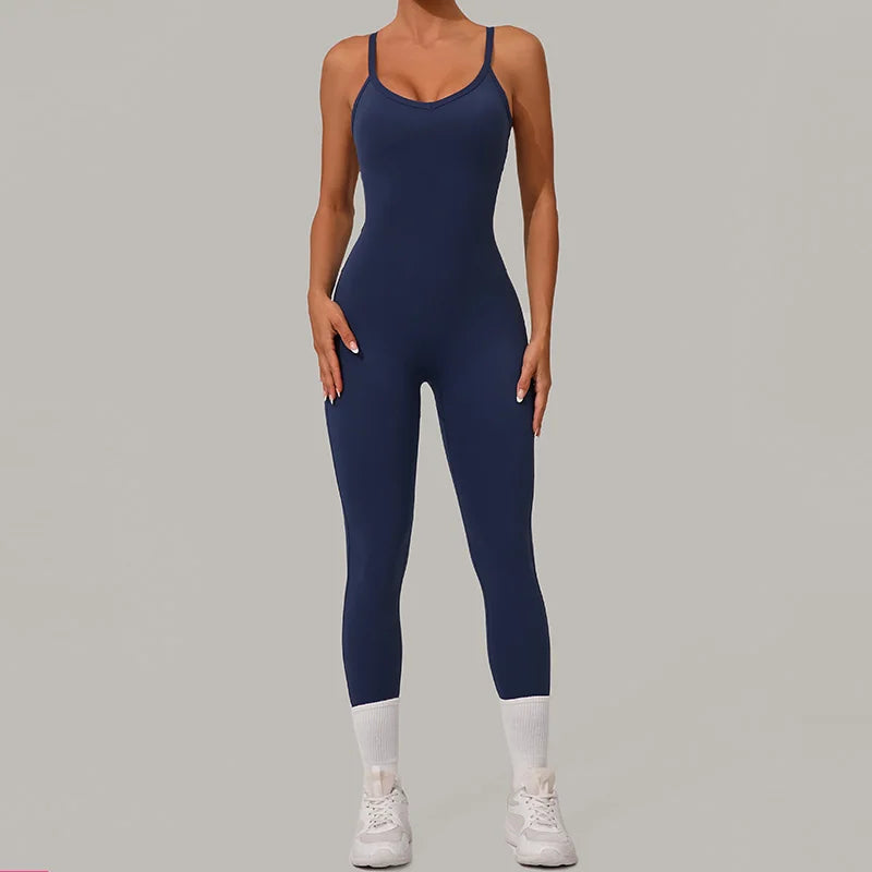 אוברול נשי מחטב עם גב מוצלב וכתפיות דקות מתכווננות, עשוי ניילון וספנדקס גמישים ונושמים.