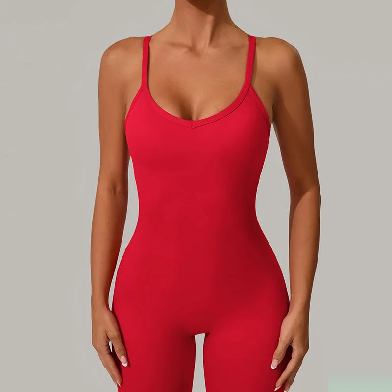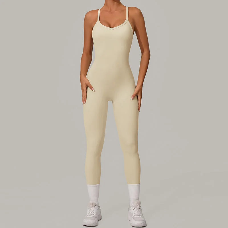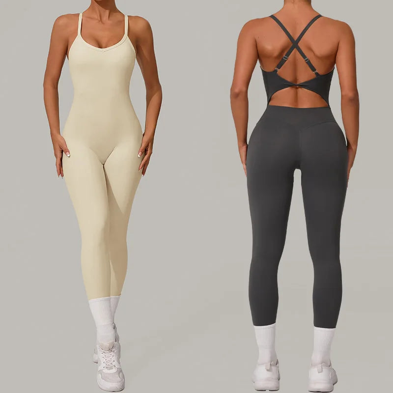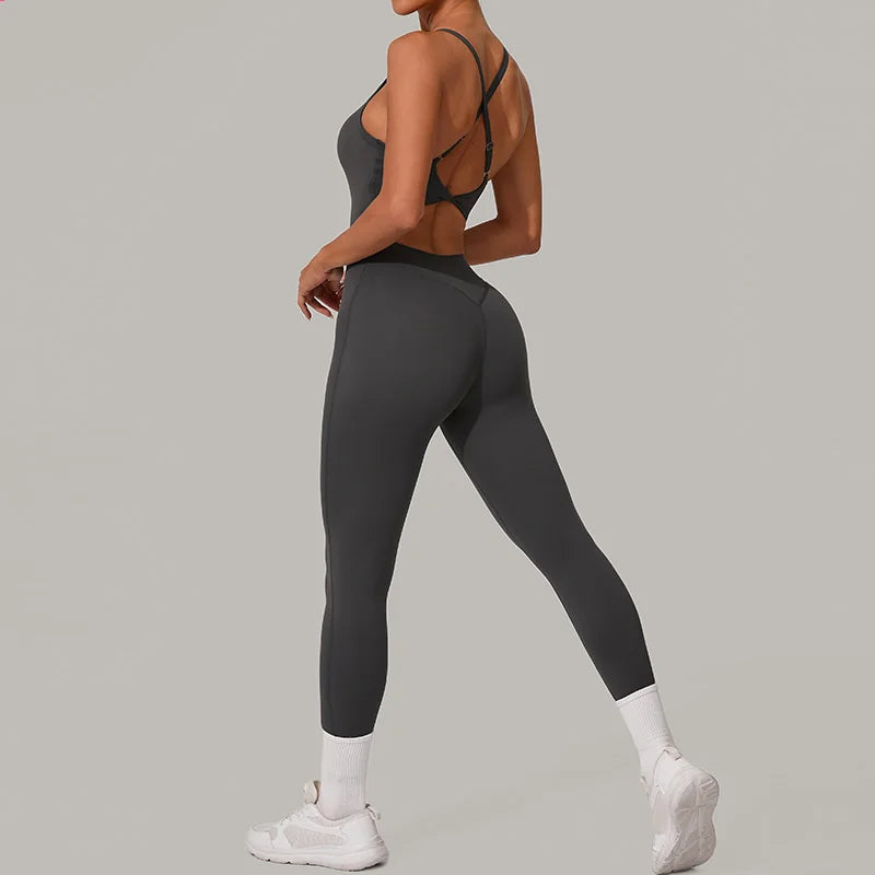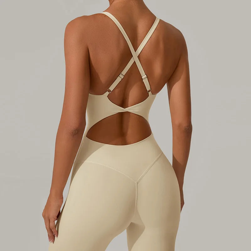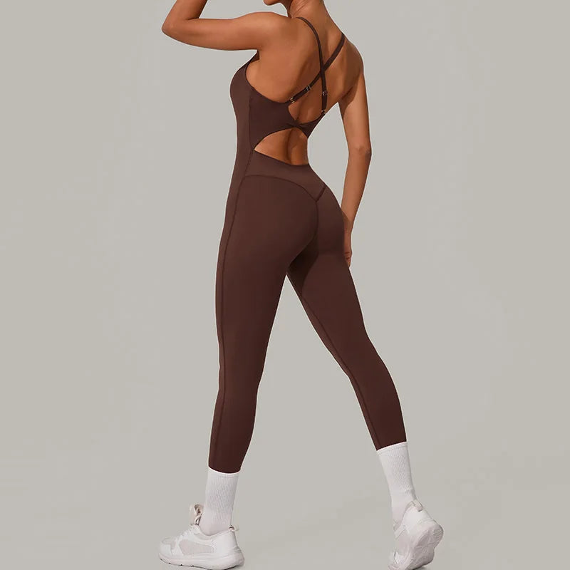 אוברול נשי מחטב עם גב מוצלב וכתפיות דקות מתכווננות, עשוי ניילון וספנדקס גמישים ונושמים.