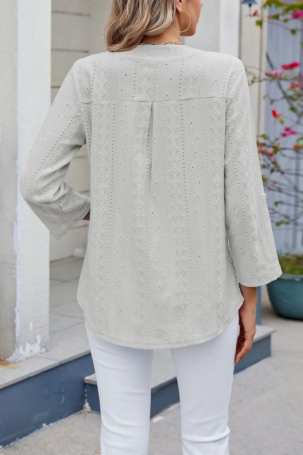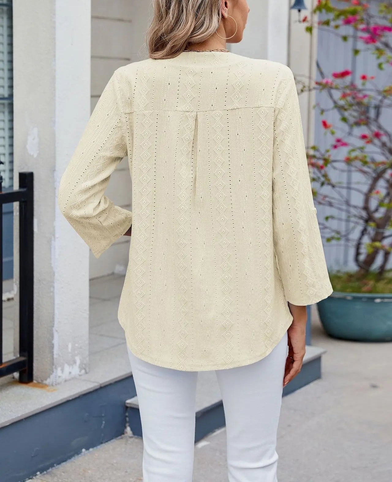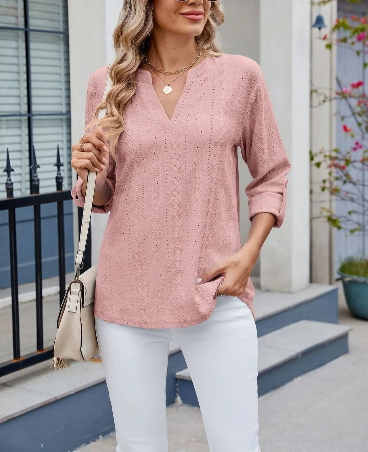 חולצת נשים אלגנטיתת מבד סינתטי משולב (Rayon + פוליאסטר + ספנדקס) לנוחות ורכות מקסימלית. הגזרה הרפויה והצווארון בצורת V מעניקים מראה מחמיא ומודרני, מושלם לשילוב יומיומי עם ג’ינס או למראה מוקפד יותר עם מכנס מחויט. שרוולים ארוכים ובד קליל שמתאים לכל עונה – פריט בסיסי עם טאץ’ של אלגנטיות יומיומית.