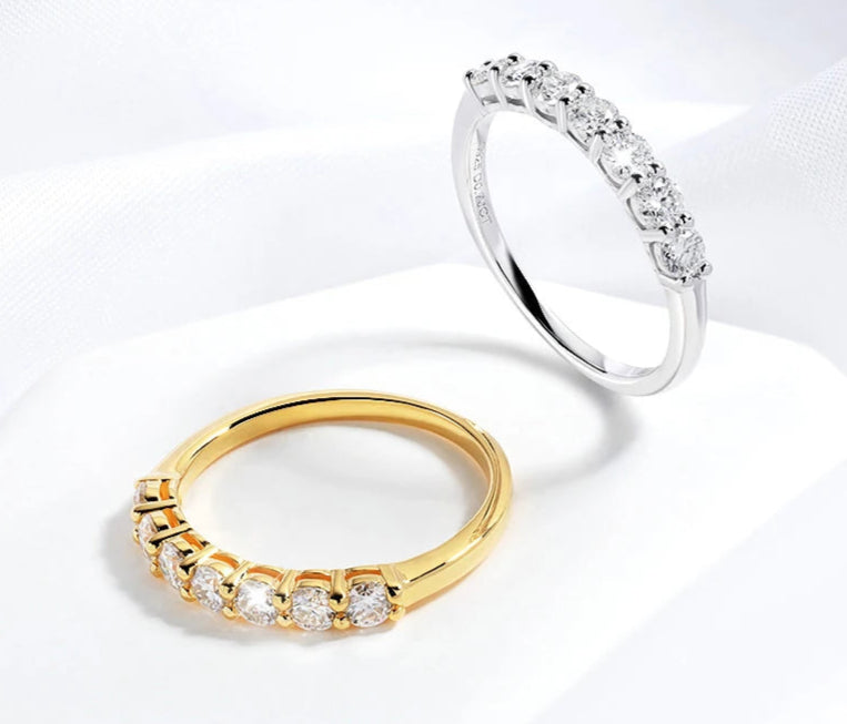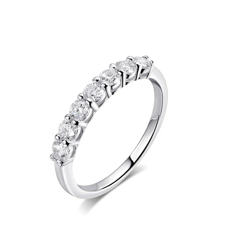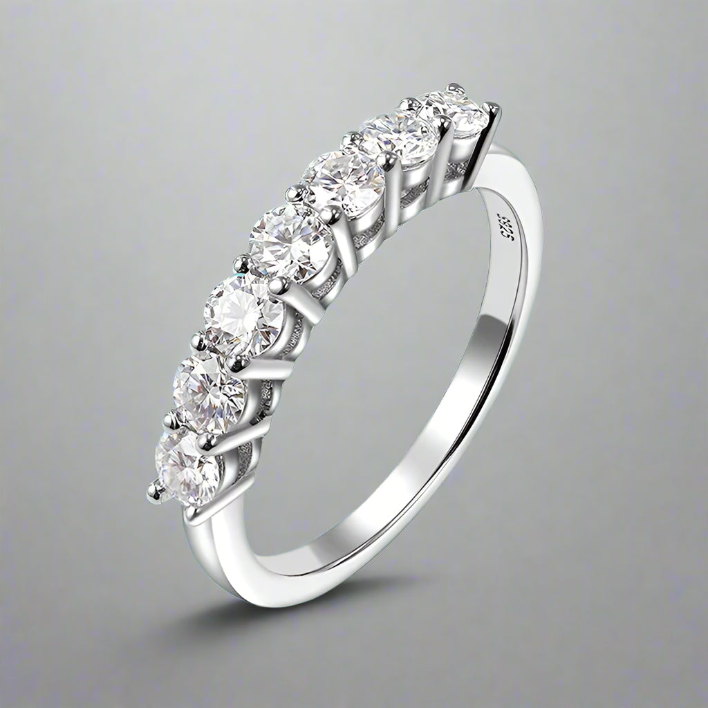 טבעת כסף סטרלינג 925 בציפוי זהב לבן ורודיום, משובצת 7 אבני מואיסנייט איכותיות בגוון D, ניקיון VVS1 וחיתוך מצוין – נוצצות יותר מיהלום. כוללת סרט הגנה לשמירה על הברק, עמידה והיפואלרגנית. מתאימה כהצעת נישואין, מתנה או כפריט יוקרה אישי.