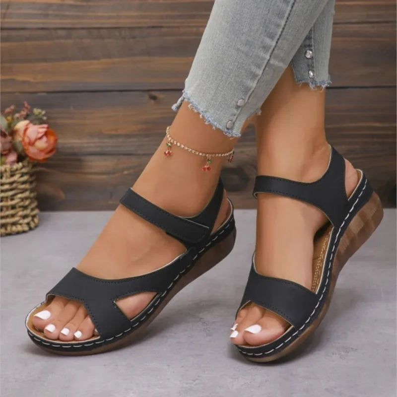 סנדלי קיץ נשיים עם עקב wedge בינוני (3–5 ס"מ) ופלטפורמה נוחה, בעיצוב פתוח ואוורירי מבד רך.