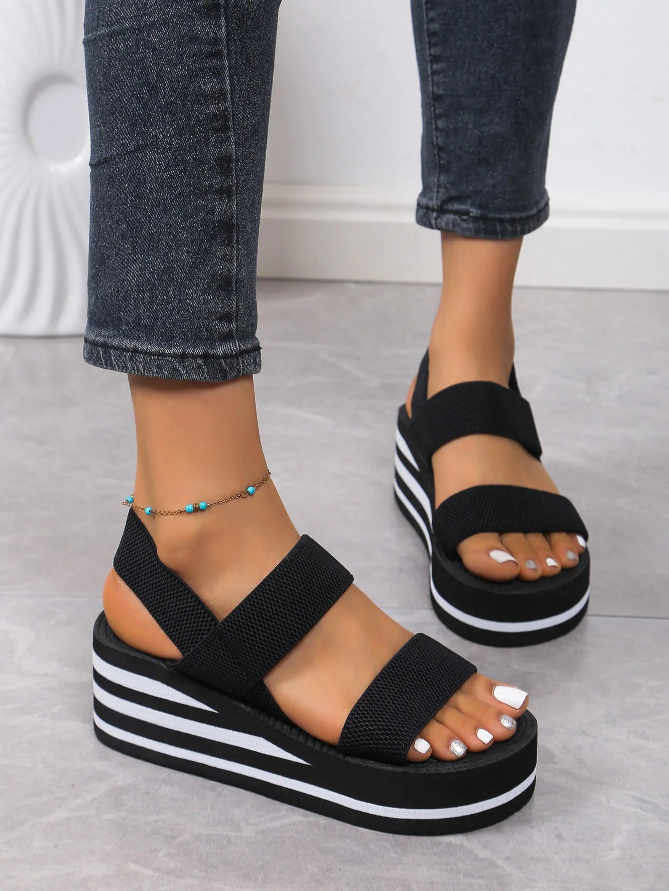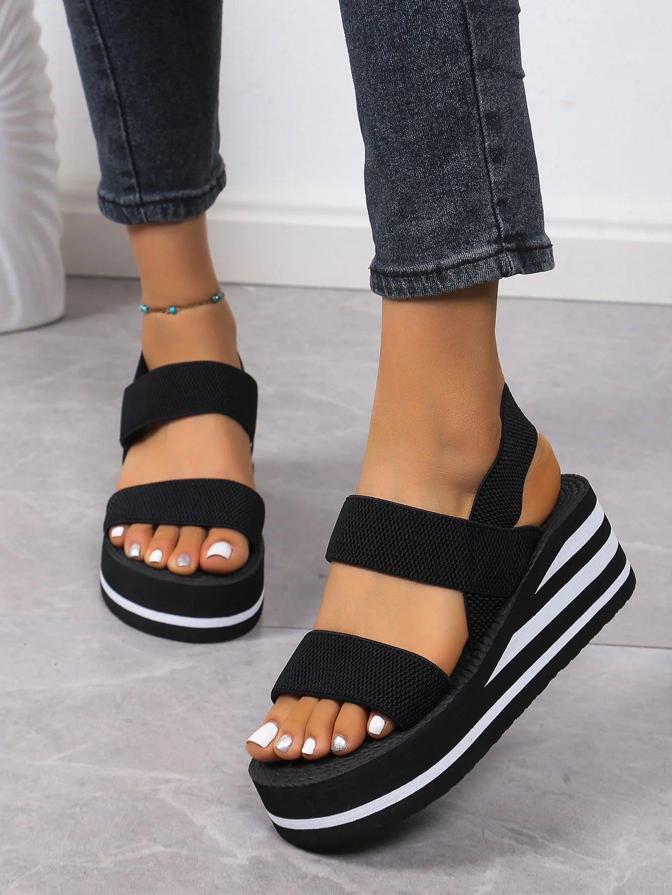 סנדלי קיץ קלילים עם עקב wedge בינוני, רצועות בד רכות ורצועת גומי אחורית לנעילה נוחה ויציבה.