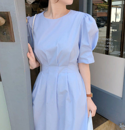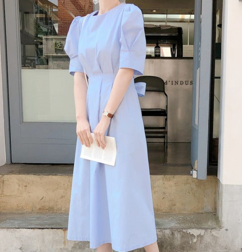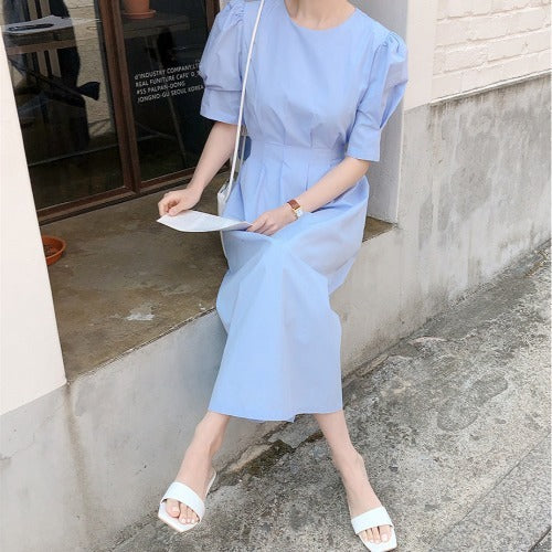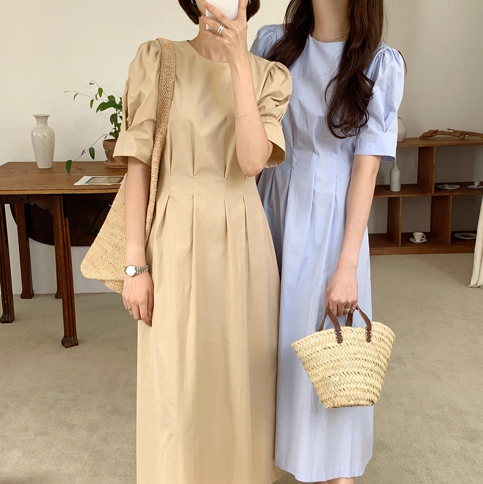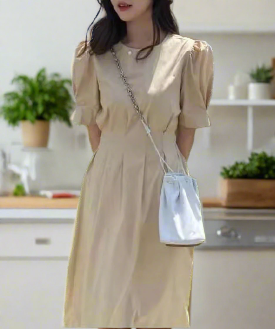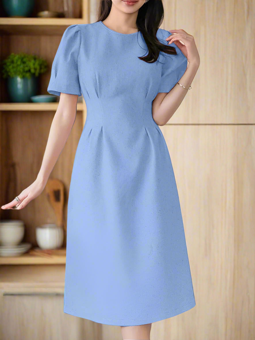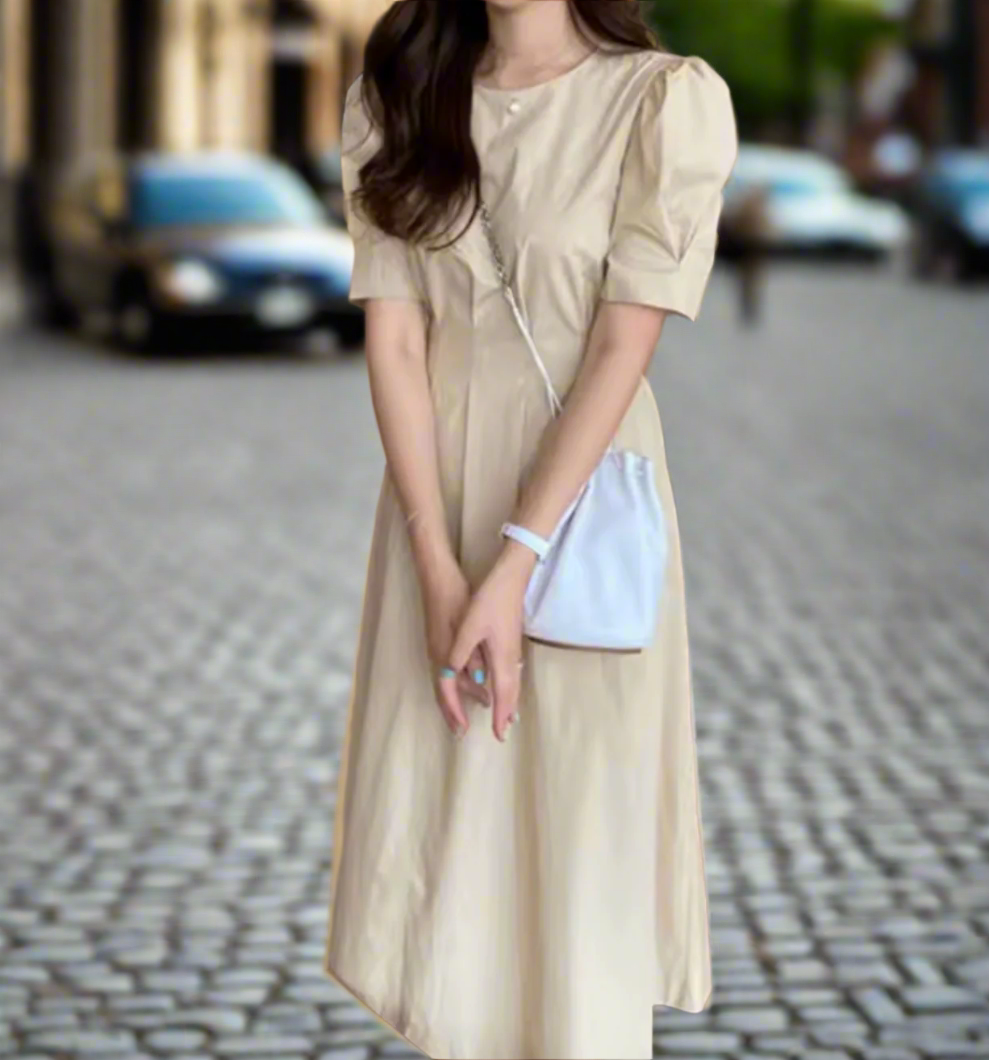 שמלת קיץ באורך מיד־שוק עם גזרת A מחמיאה ושרוולים תפוחים טרנדיים, עשויה 100% פוליאסטר קליל ונושם.