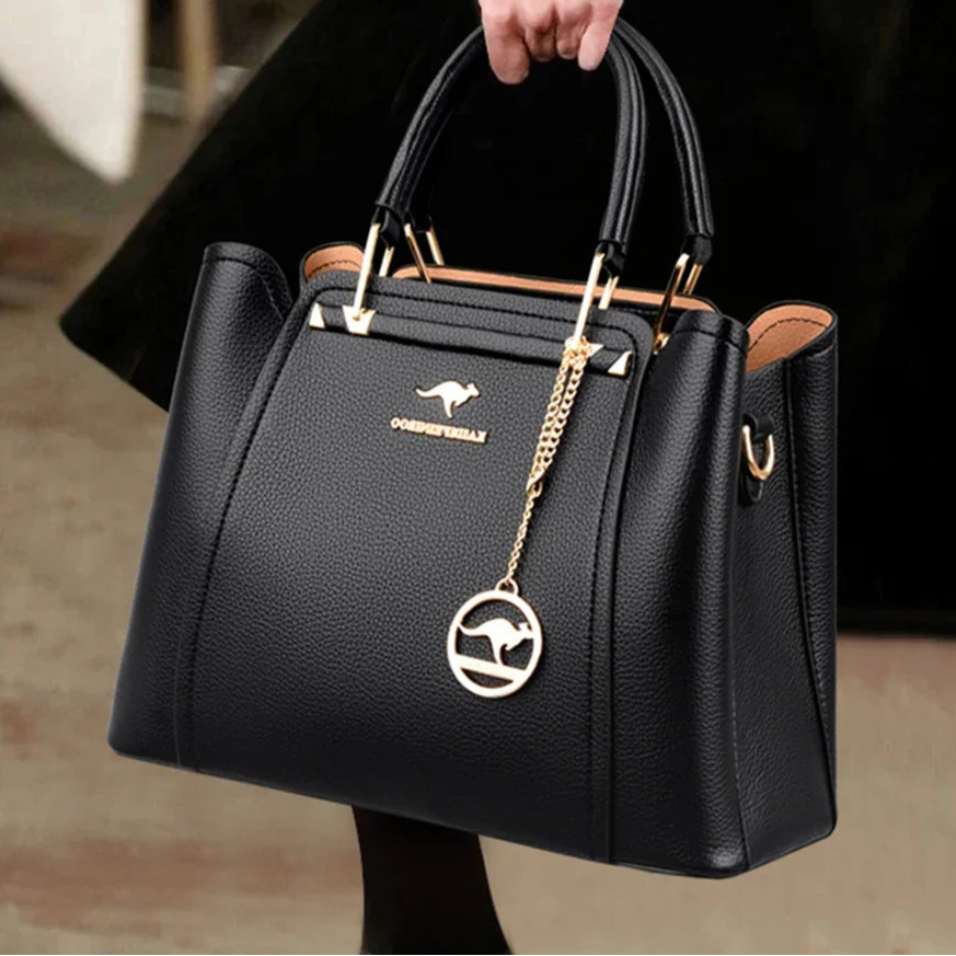עיצוב מודרני עם רצועה נשלפת ועיטור קנגורו מוזהב ייחודי, פנים מאורגן ותאים נוחים.