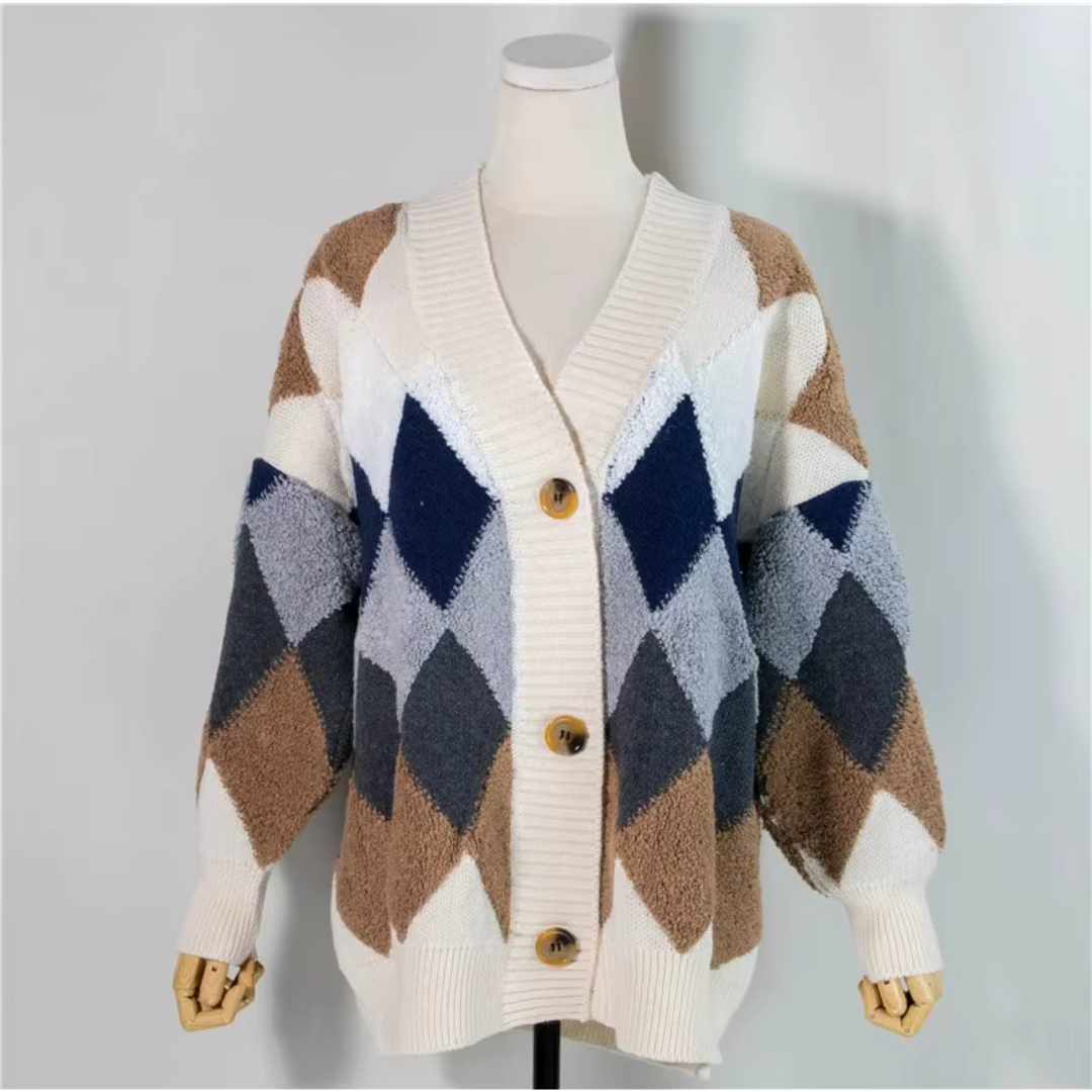 עשוי מסריג עבה ואיכותי בגזרת אוברסייז נעימה, עם צווארון V קלאסי וסגירת כפתורים קדמית.