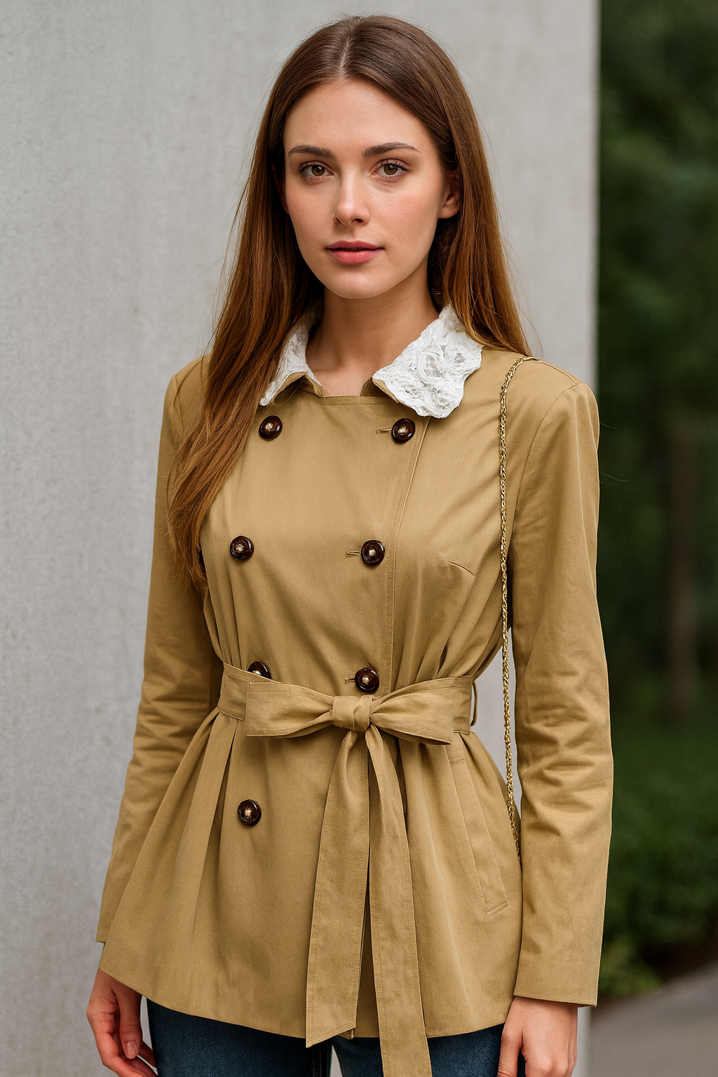 המעיל Celestine מביא איתו נגיעה מהאופנה הצרפתית הקלאסית: גוון קאמל־חאקי מרשים, גזרת אוברסייז משוחררת ונוחה, וצווארון בובה מעוטר תחרה שמעניק מראה רך, יוקרתי ועל־זמני.