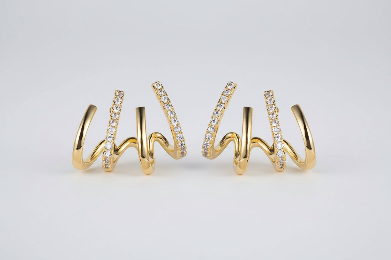 עגילי סטאד אלגנטיים בעיצוב מינימליסטי עם נוכחות רכה ונשית. שיבוץ הקריסטל המבריק במסגרת ארבע שיניים יוצר מראה נקי, מאוזן ומעודן, המשלב בין רומנטיקה מודרנית לאסתטיקה קוריאנית עכשווית.