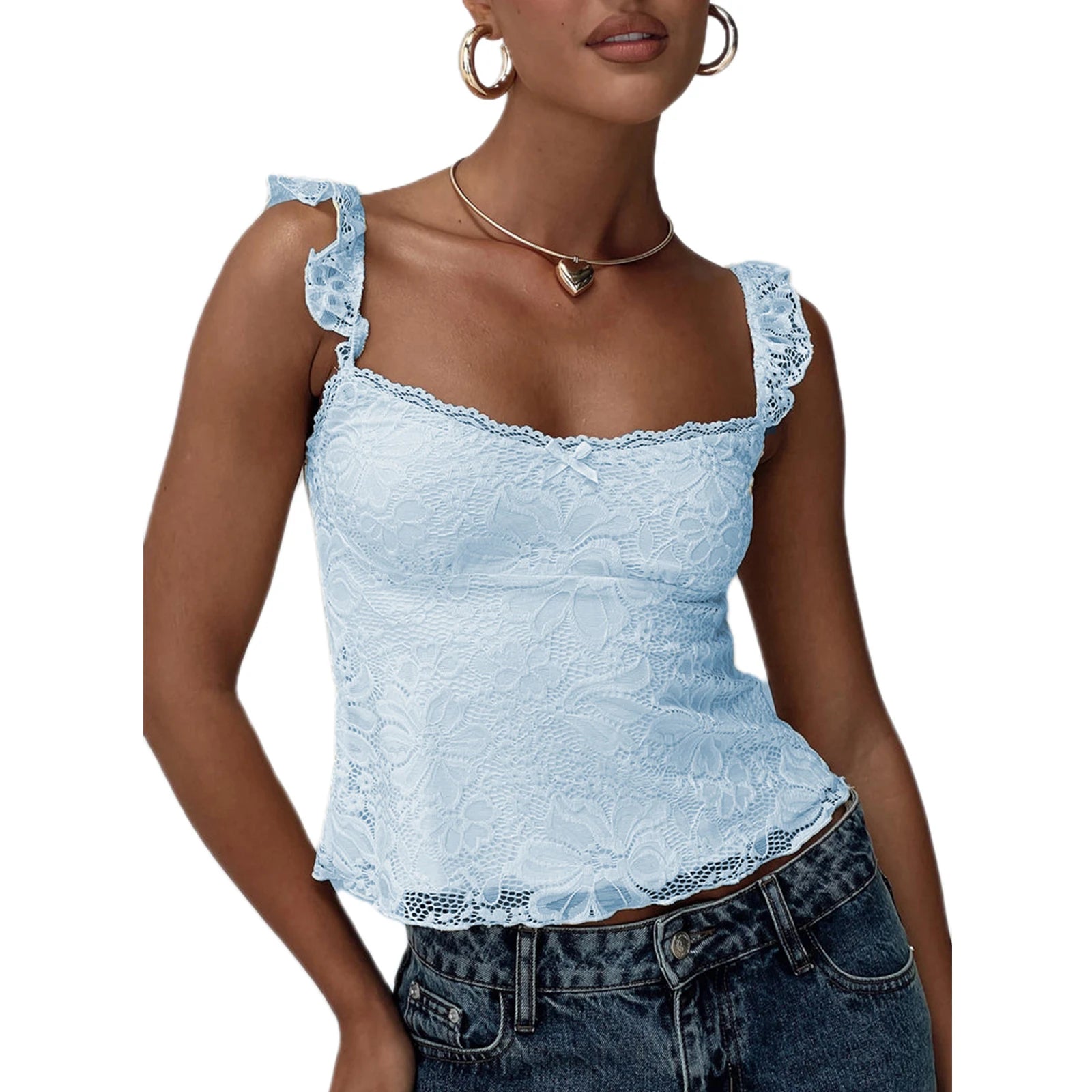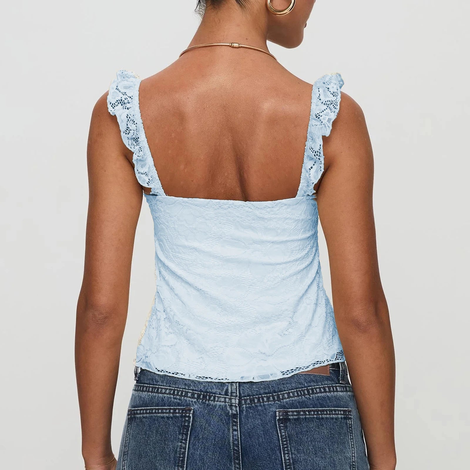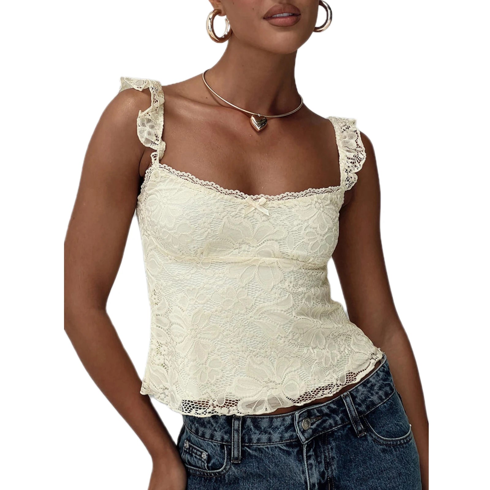 FLORENCIA מציג טופ קיץ נשי ועדין עם שילוב תחרה פרחונית שמעניקה מראה אלגנטי ומלא סטייל.