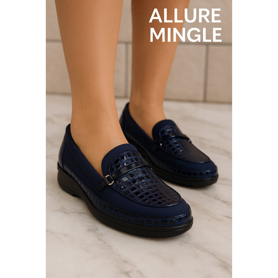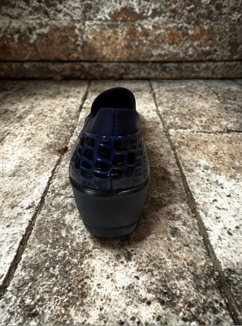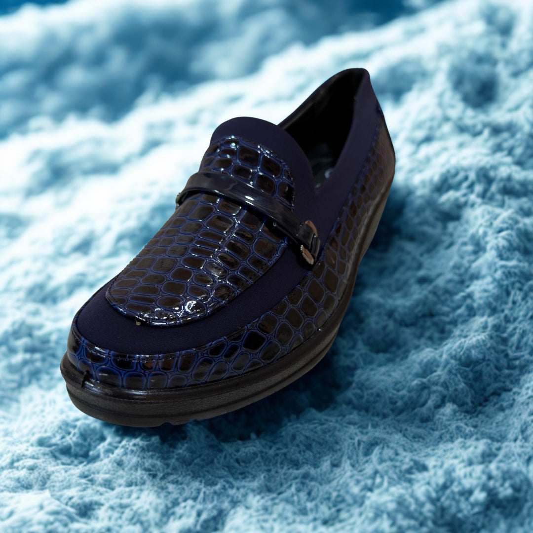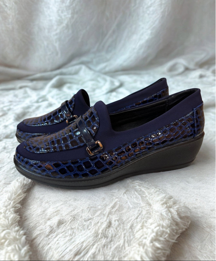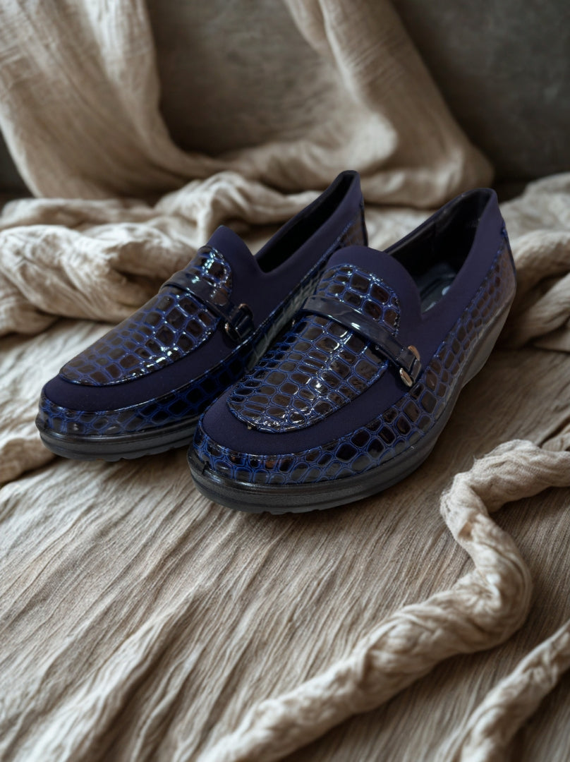 לואפרס שטוחים עם טקסטורת קרוקו מבריקה בגוון כחול עמוק. שילוב מושלם של קלאסיקה מודרנית לנראות יומיומית או ערב.