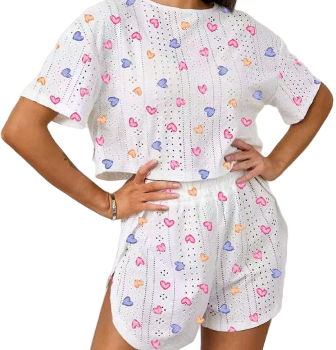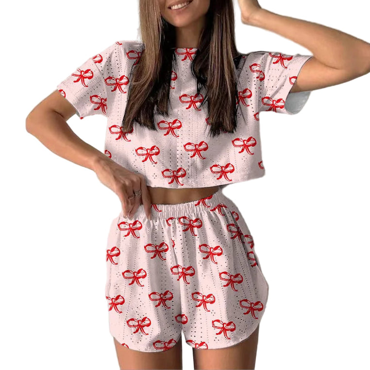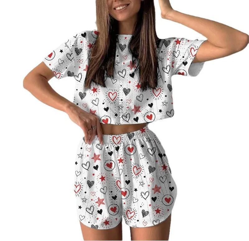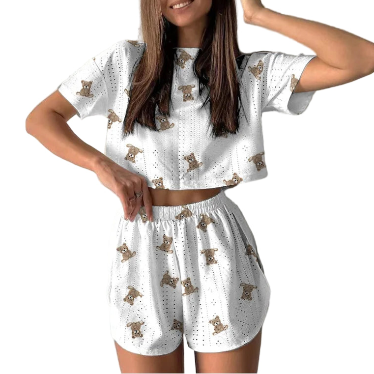 סט דו־חלקי לנשים הכולל חולצת קרופ קצרה עם שרוולים קצרים ומכנסי שורט נוחים בגזרה גבוהה. עשוי מפוליאסטר נושם עם מתיחה בינונית לנוחות מקסימלית. עיצוב מודפס מתוק עם דובי קטן מעניק מראה צעיר, רענן וקליל – מושלם לבית, לבילוי יומיומי או לסטייל ספורטיבי בקיץ.