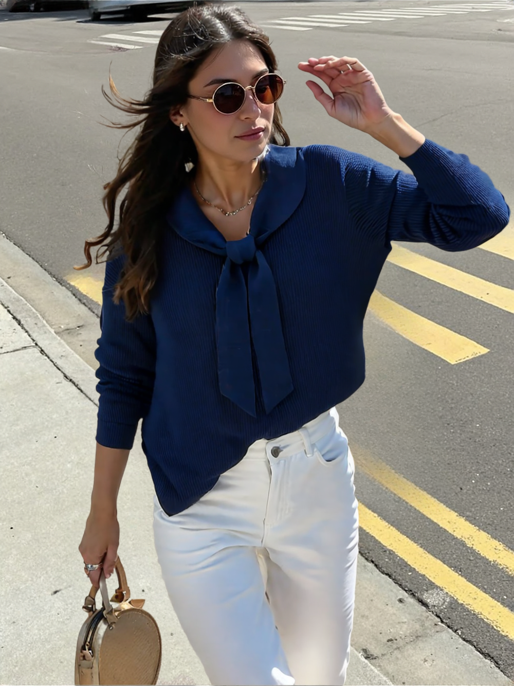סוודר סרוג בגזרה רפויה עם צווארון פיטר פן עדין ושרוולים ארוכים, היוצר מראה נשי, רגוע ומעודן. הסריג במשקל בינוני עם גמישות נעימה מעניק נוחות טבעית וזרימה רכה על הגוף, ומתאים במיוחד לעונות הסתיו והחורף – לשילוב אלגנטי ביומיום, בעבודה או בלוק קז’ואל מוקפד.