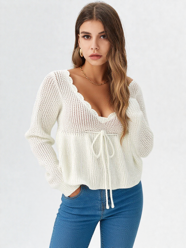 גזרת וי מחמיאה, שרוולים ארוכים ובד סרוג רך יוצרים מראה אלגנטי אך נינוח, שמתאים ליום-יום וגם לערב.