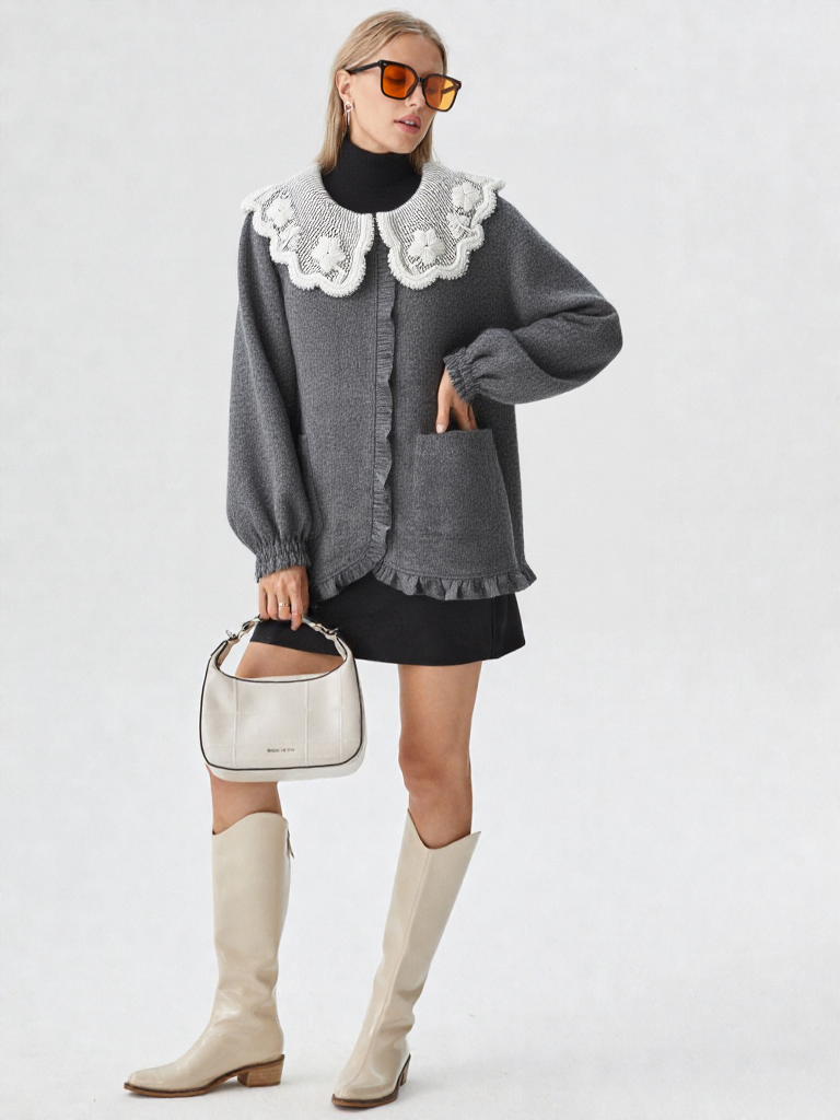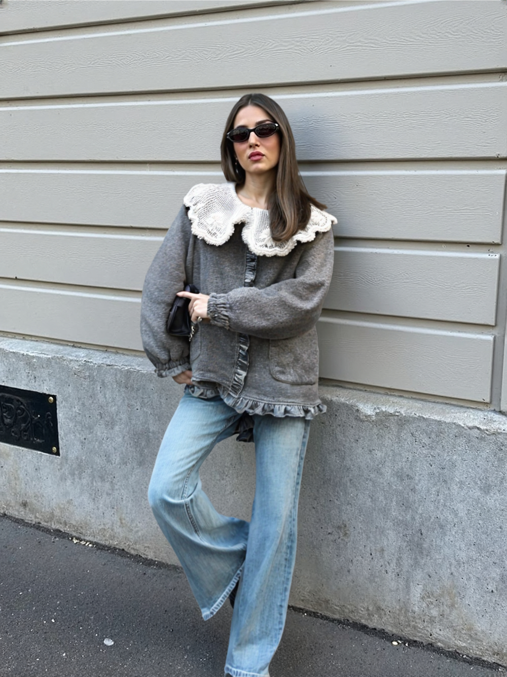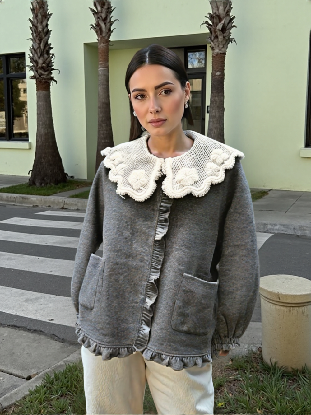 הצווארון המעוטר בתחרה עדינה מעניק אופי רומנטי וייחודי, בעוד הגזרה הרפויה שומרת על נוחות מלאה ומראה מחמיא. צבע אפור חלק מאפשר שילוב קל עם כל מלתחת חורף – מג’ינס ועד שמלות סריג.