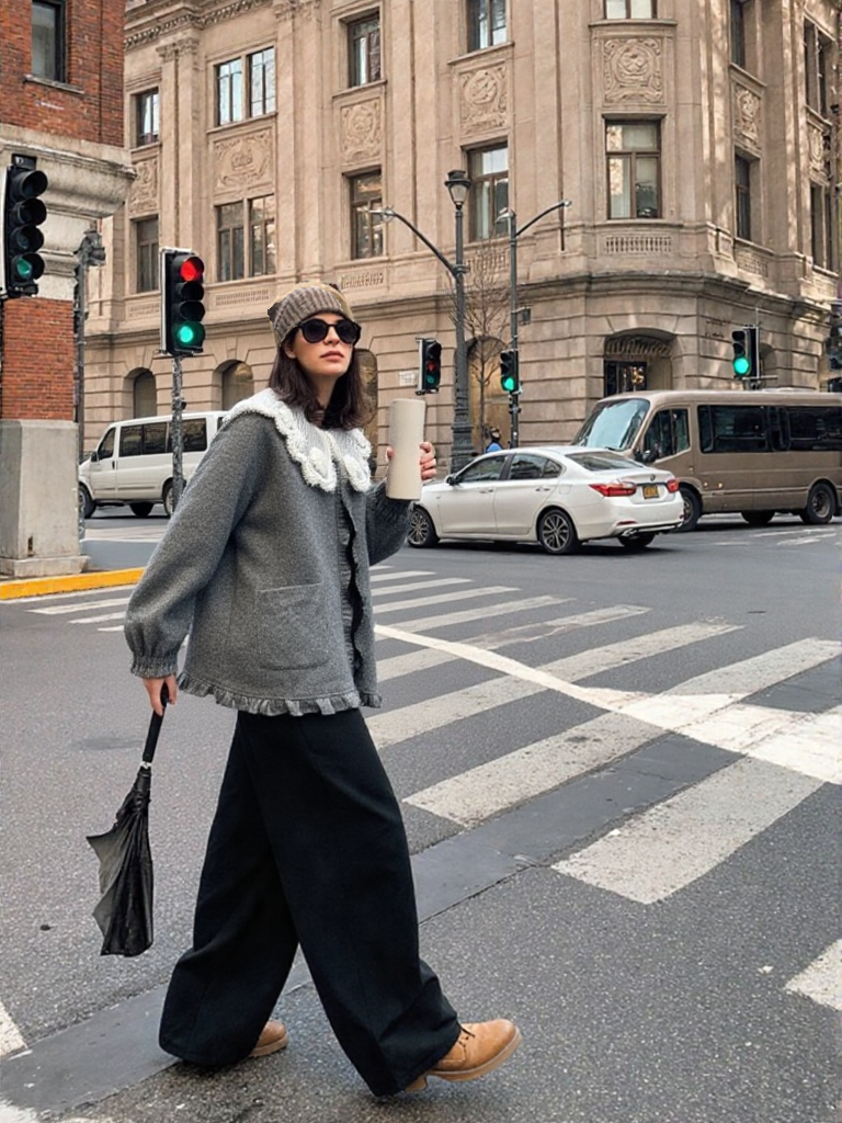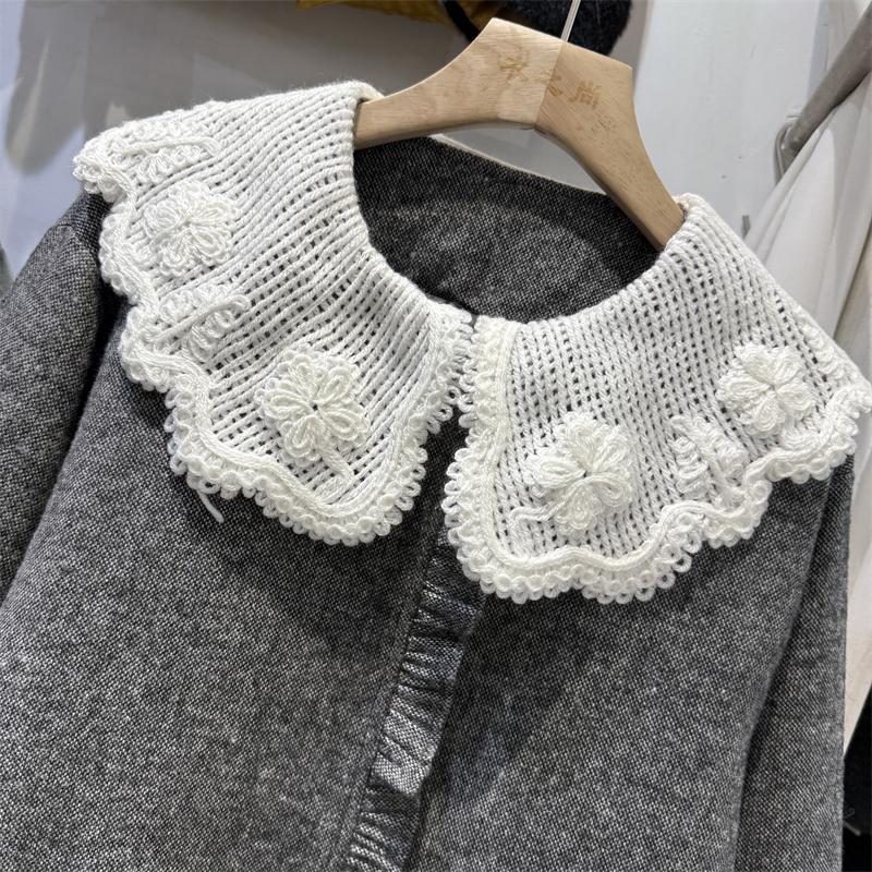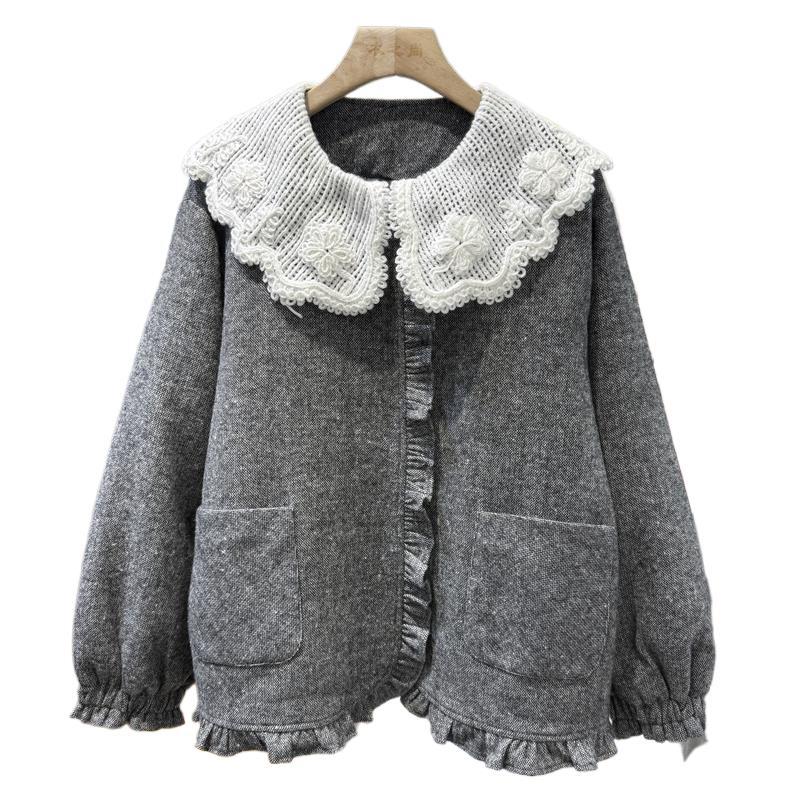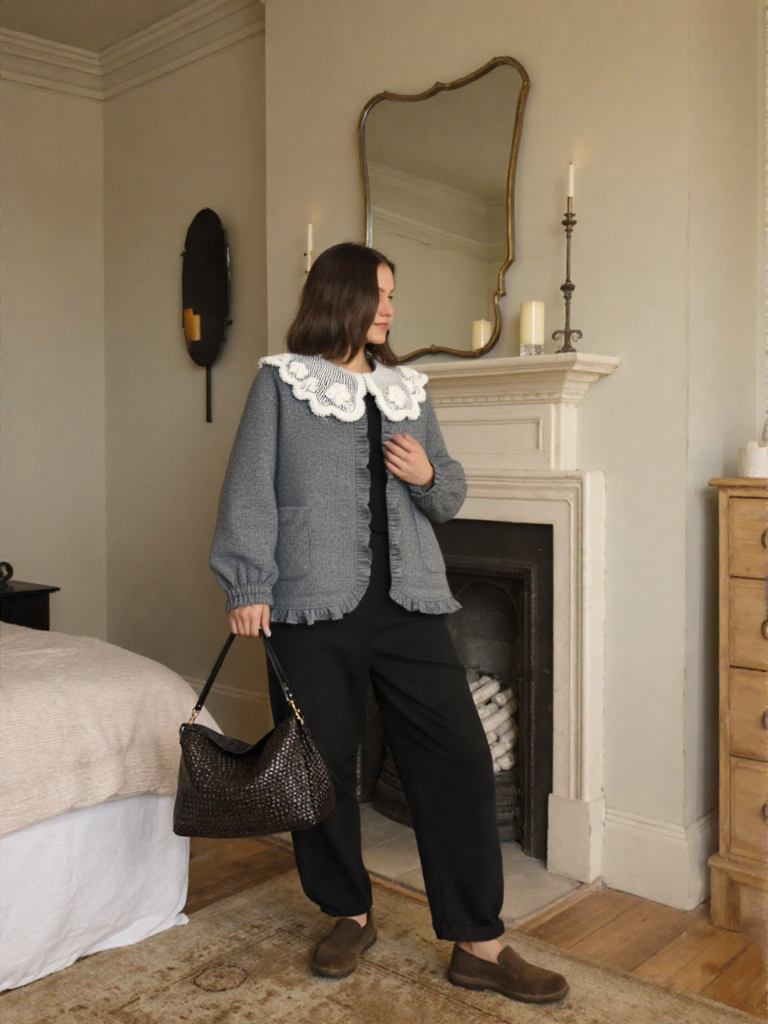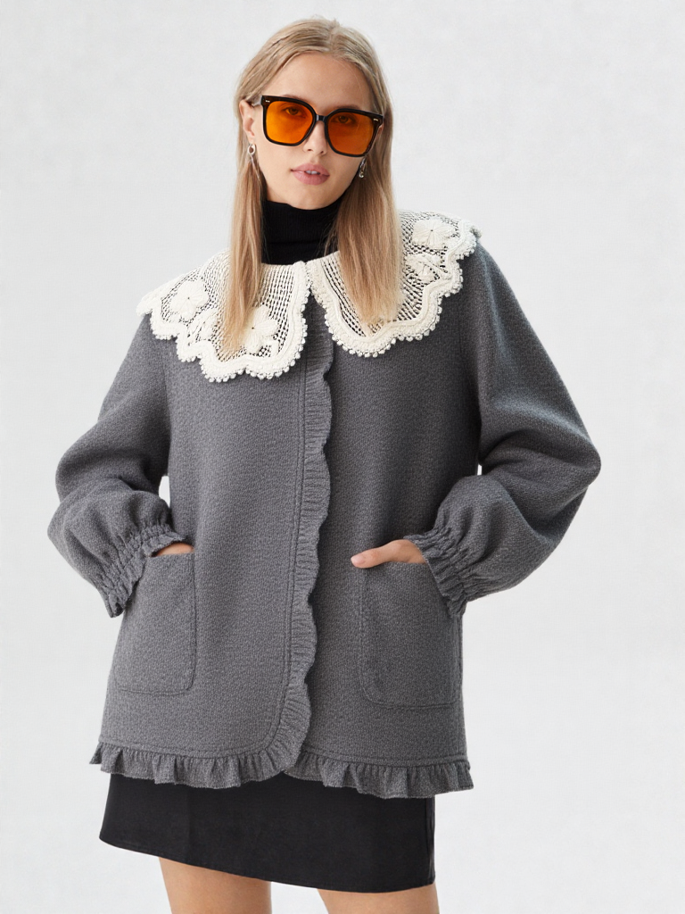 הצווארון המעוטר בתחרה עדינה מעניק אופי רומנטי וייחודי, בעוד הגזרה הרפויה שומרת על נוחות מלאה ומראה מחמיא. צבע אפור חלק מאפשר שילוב קל עם כל מלתחת חורף – מג’ינס ועד שמלות סריג.