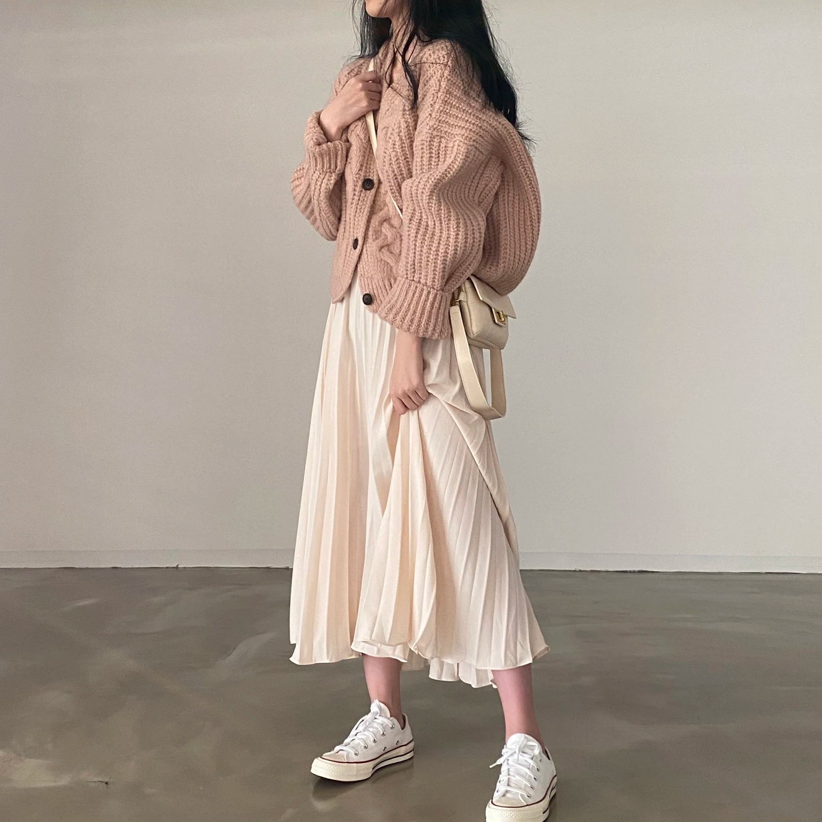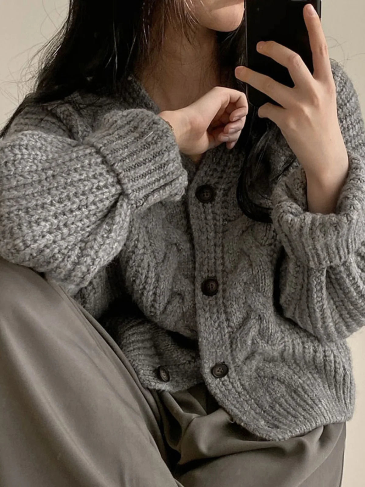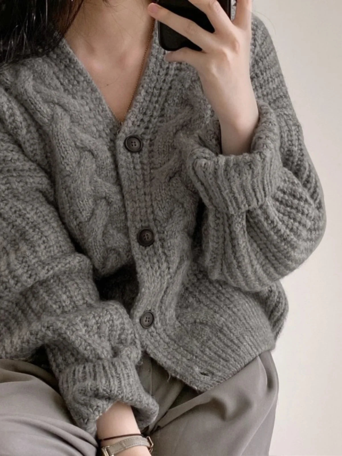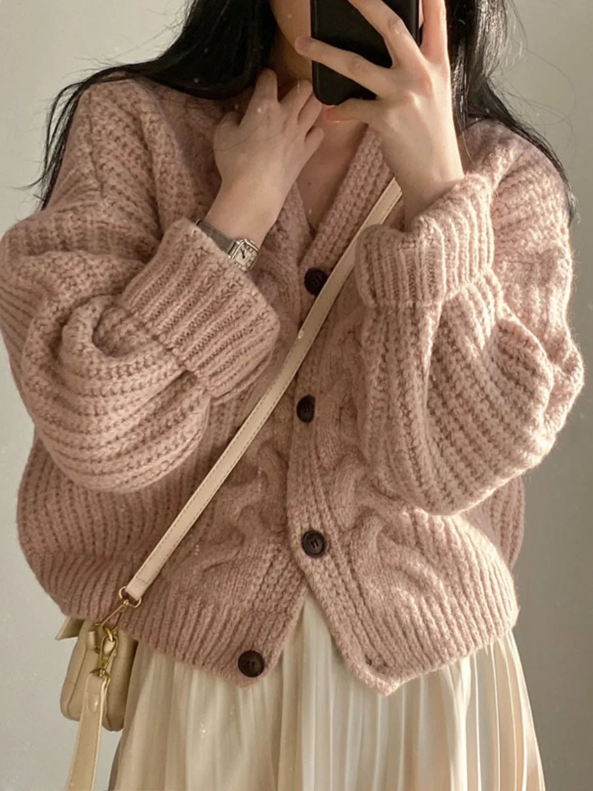 הצווארון בצורת V והכפתור הבודד במרכז מוסיפים נגיעה אלגנטית ועדינה,
