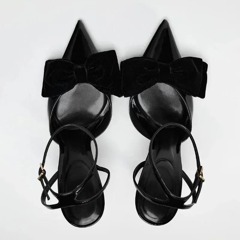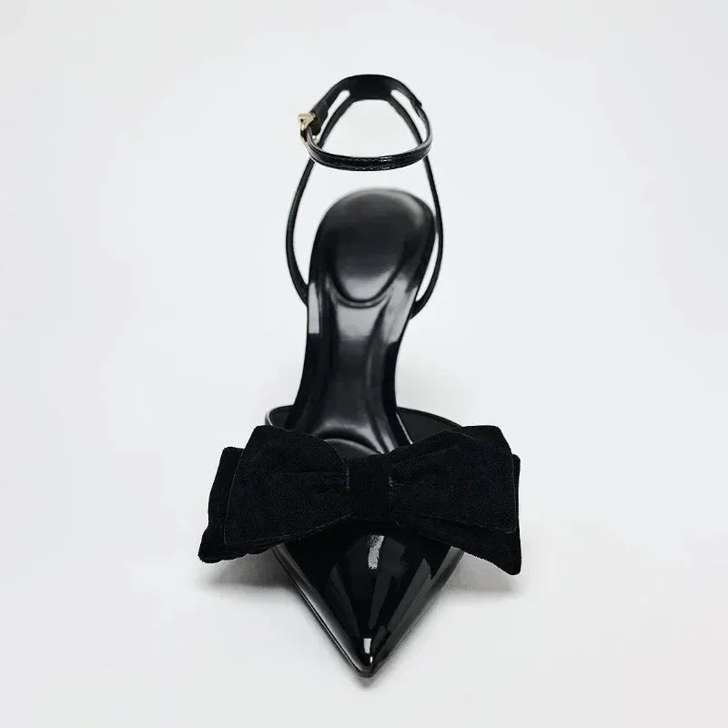 דגם נשי וקלאסי בגימור לק שחור מבריק עם פפיון עדין בחזית.
