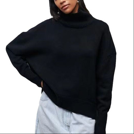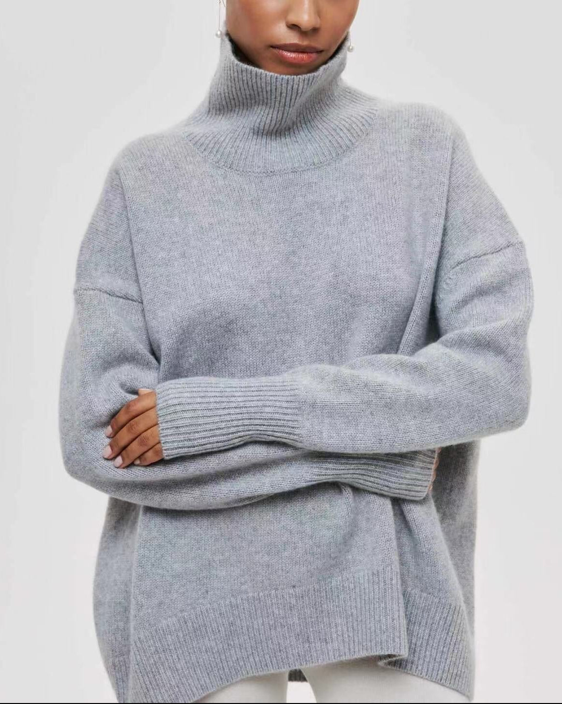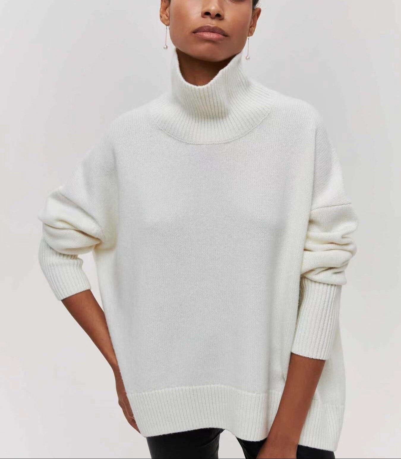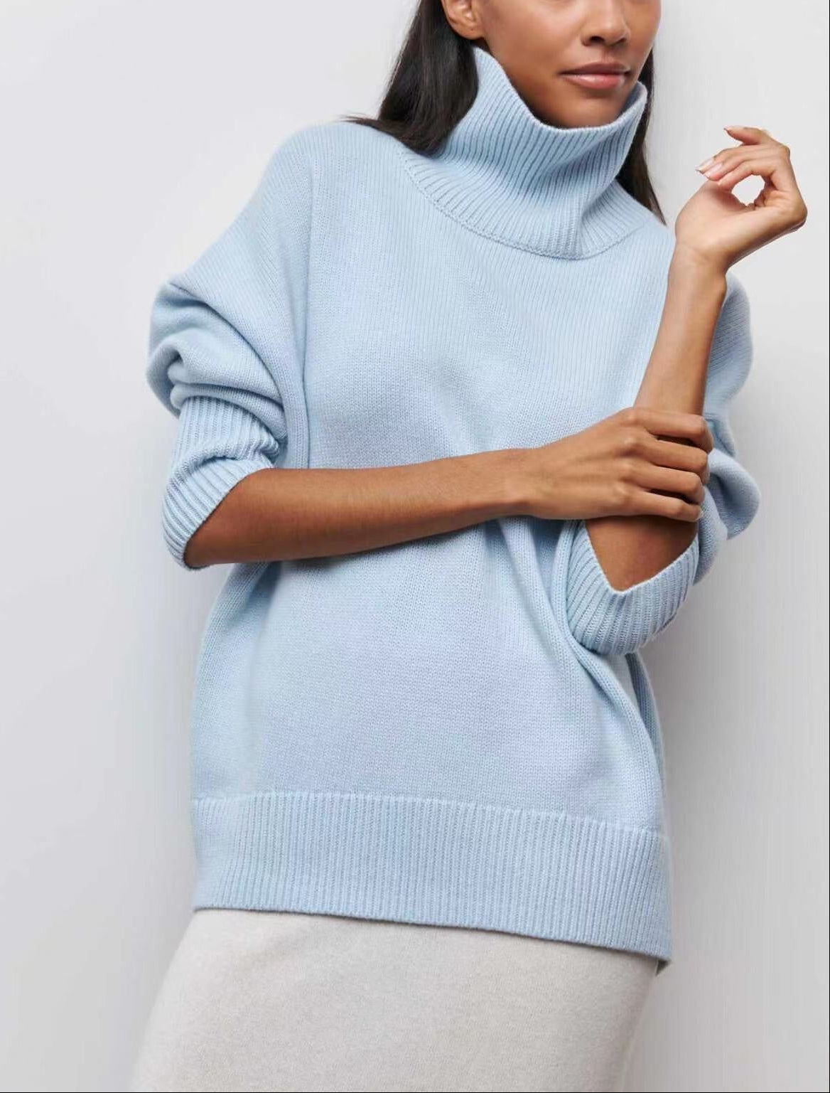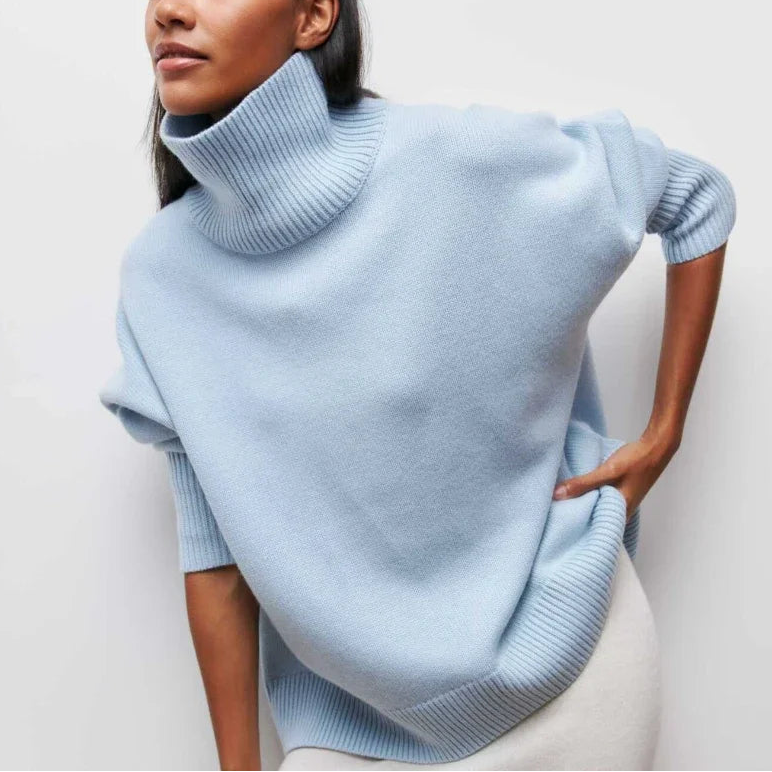 סוודר חורפי אלגנטי בגזרה רפויה ונינוחה, עם צווארון גבוה (גולף) ושרוולים ארוכים למראה נקי ומתוחכם.